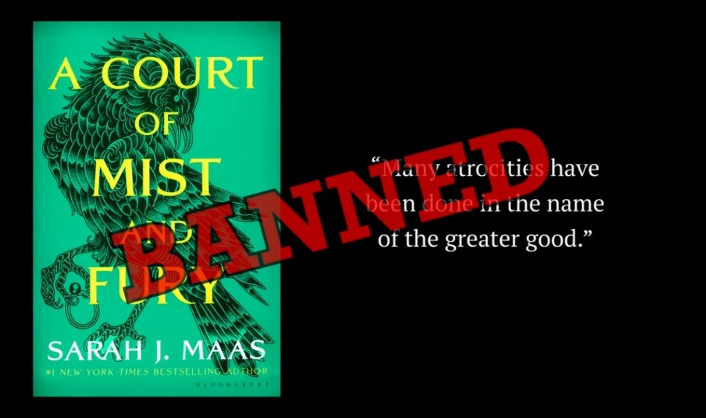 At the 23 minutes 54 seconds mark, Nevins shows the cover of Sarah J. Maas’s A Court of Mist and Fury with the quote “many atrocities have been done in the name of the greater good.” It makes you think, ‘Why would a book like this be banned with such an insightful view of the world?’
